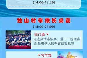 下午18:00-21:00 独山村布依长桌宴(拦门酒、竹竿舞、布依寨歌、高山流水、布依八大碗、篝火晚会)