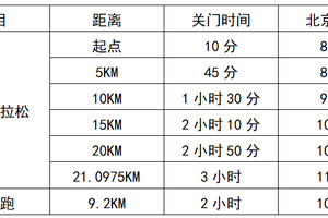 1. 为了保证参赛选手比赛安全、顺利,赛事期间比赛路线各段设关门时间,限时对社会交通封闭。关门时间后,相应路段恢复社会交通。在规定的关门时间内,未跑完对应距离的参赛选手须立即停止比赛,退出赛道,以免发生危险。若有需要,退出比赛的选手可乘坐组委会提供的援助车或自行选乘公共交通抵达终点。关门时间按自然时间计算,具体见下表:(考虑净计时造成的延时出发因素)